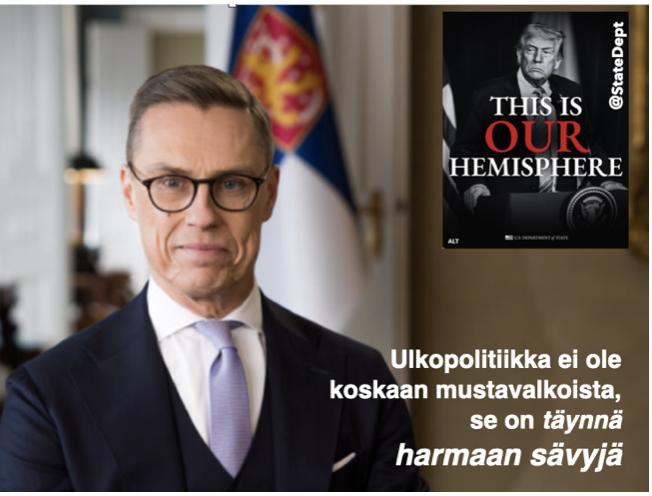 Presidentti Alexander Stubbin uudenvuodenpuheesta nousi metakka: presidentin harmaa kravatti oli vinossa! Miten se on mahdollista! Minä kiinnitin huomiotani enemmänkin siihen, että presidentti oli harmaantunut myös ajatuksissaan: ”Ulkopolitiikka ei ole koskaan