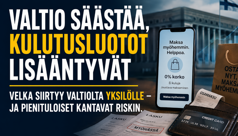 Suomessa käydään kiivasta keskustelua suuresta julkisesta velasta. Vähemmälle huomiolle on jäänyt, että myös kotitaloudet, kiitos uusien kulutusluottojen, ovat velkaantuneet. Suurimmassa ylivelkaantumisen riskissä ovat jälleen pienituloiset, joihin uudet velkainstrumentit usein käytännössä