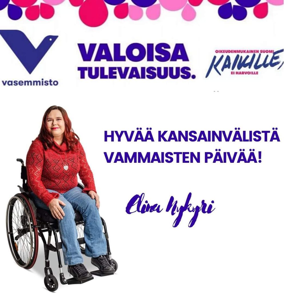 Hyvää kansainvälistä vammaisten päivää! Rakennetaan yhdessä yhdenvertainen, tasa-arvoinen, esteetön, saavutettava ja kakkien ihmisoikeuksia kunnioittava maa. Maa, jossa kaikki voivat hyvin, eivät vain harvat 🥰. Jokainen meistä on yhtä arvokas. Vammaisellakin pitää olla oikeus haaveilla ja elää omanlaistaan elämää.