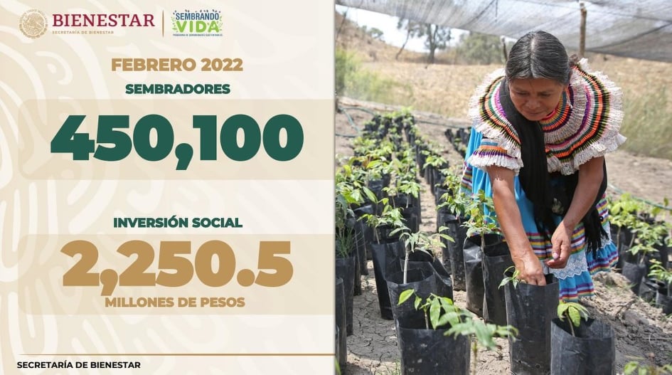 Elämää kylvämässä (Sembrando Vida) on maatalouden väelle suunnattu ohjelma, joka edistää heidän tehokasta osallistumistaan kokonaisvaltaiseen maaseudun kehittämiseen. Se kattaa tällä hetkellä 20 osavaltiota 32:sta. Se kannustaa maaseudun ihmisiä perustamaan peltometsätalouden tuotantojärjestelmiä, joissa perinteisten viljelykasvien tuotanto yhdistetään hedelmä- ja puutalouden kanssa, sekä hedelmälajikkeilla rikastettuun vuosituhantiseen milpa-viljapeltojärjestelmään (MIAF), joka edistää työpaikkojen luomista, rohkaisee elintarvikeomavaraisuuteen, parantaa asukkaiden tuloja ja palauttaa maan metsäpeitteen yli miljoonan hehtaarin alueelle. Tällä hetkellä 1,1 miljoonan hehtaarin luku on ylitetty. Puita on istutettu tähän mennessä yli 800 miljoonaa yksikköä, mutta tavoitteena on 1,1 miljardia uutta elämää. Taloudellista tukea myönnetään 5 000 pesoa tai 216,1 euroa kuussa niille pienviljelijöille, jotka omistavat tai pitävät hallussaan peltometsätaloushankkeisiin käytettävissä olevan 2,5 hehtaarin maa-alueen. Edunsaajat saavat kuukausittaista rahallista tukea sekä luontaissuorituksina tarjottavaa apua tuotantoon (kasvit, tarvikkeet, työkalut) sekä teknistä neuvontaa agrometsätalouden järjestelmien toteuttamiseen. Ohjelman periaatteiden mukaan teollisia kemikaaleja ei käytetä, vaan kaikki tuotanto on orgaanista ja ekologista, lisäksi kiinnitetään erityistä huomiota vedestä ja eläimistöstä huolehtimiseen. Ohjelman teknikot jakavat yhtäältä tietoa ja kokemuksia talonpoikien kanssa sekä toisaalta oppivat luonnon ja alueidensa kanssa pitkään eläneiden ihmisten viisaudesta.