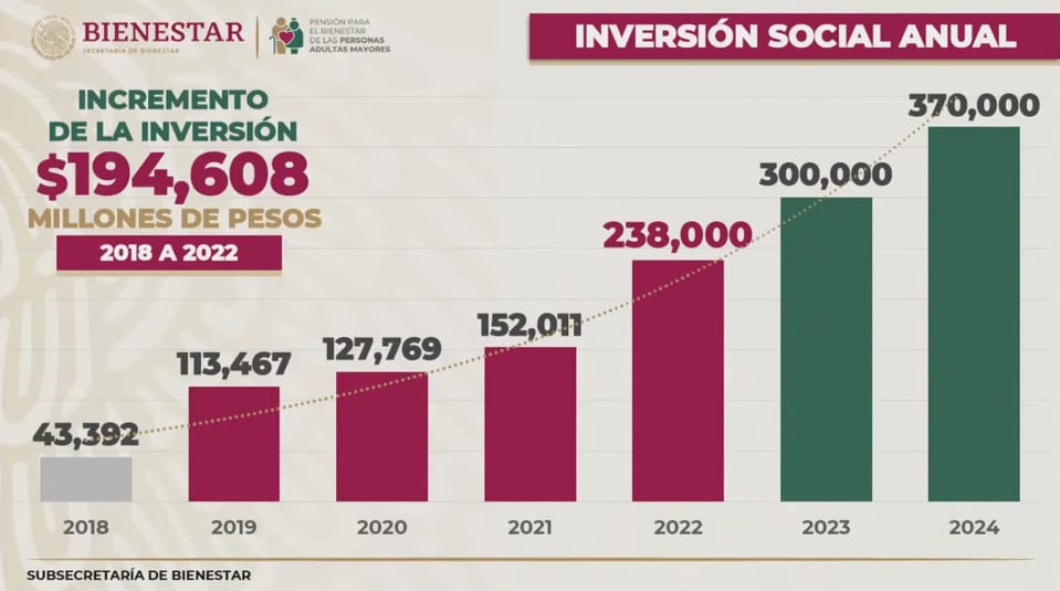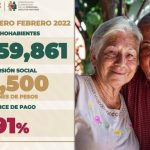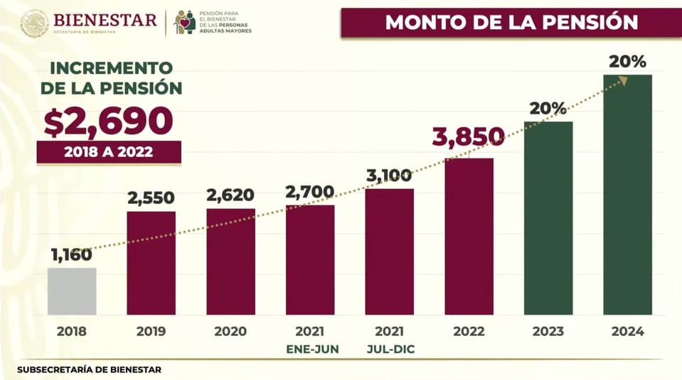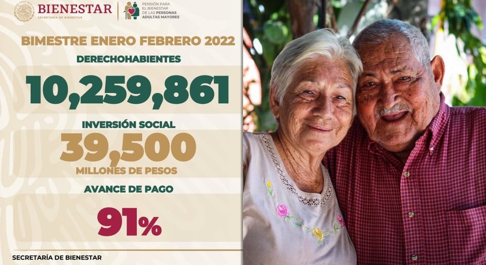 Valtion yleisten eläkkeiden kehittäminen jatkuu. Uusia eläkkeensaajia saatiin eläkeiän pudottamisen vuoksi puolen vuoden aikana tuen piiriin 2,2 miljoonaa lisää, sillä lokakuussa 2021 heitä oli vasta 8,1 miljoonaa ja marraskuussa 9 350 000. Äskettäin edellisen vuoden heinäkuussa ikävaatimus laskettiin 68 vuodesta 65 vuoteen. Aiemmin vain 65-vuotiaat afromeksikolaiset ja alkuperäiskansojen jäsenet saivat tukea kolme vuotta muuta väestöä aikaisemmin. Tammikuun 2022 lopussa tuensaajien määrä kipusi jo yli 10,3 miljoonan, kun viime hallituskaudella valtion maksamia eläkkeitä sai alle 5,6 miljoonaa henkeä. Eläke ei estä työntekoa eikä vaikuta verotukseen ja se maksetaan myös kaikille työeläkettä saaville seniorikansalaisille.