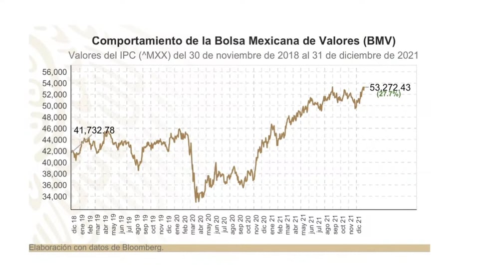 Presidentti López Obradorin kaudella Meksikon pörssissä (Bolsa Mexicana de Valores) on koettu 27,7 prosentin arvonnousu. Joulukuun 2021 tietojen mukaisen presidenttikauden aikana peso on heikentynyt suhteessa dollariin vain 0,8 prosenttia, kun Venäjän rupla on taantunut 11,5, Perun valuutta Sol 18,3, Kolumbian peso 26,2, Chilen peso 26,7 ja Brasilian Real 44,2 prosenttia. Uusliberaalin kauden presidenttien kolmen ensimmäisen vuoden ja yhden kuukauden arvonlasku tai devalvaatio suhteessa dollariin vuosien 2000–2015 välillä oli: 17,5 – 19,2 ja 39,6 edellisen presidenttikauden puolivälissä. 0,8 ei siis ole huono lukema huomioon ottaen pandemia ja sen mukanaan tuoma talouskriisi. Miguel de la Madridin lopettaessa presidenttikautensa marraskuun viimeisenä päivänä 1988 dollarilla sai 1,76 pesoa. Kun Enrique Peña Nieto luopui vallasta marraskuun 2018 lopussa yhdellä dollarilla sai 20,37 pesoa. Vuoden 2021 lopussa peson arvo oli 20,53 suhteessa dollariin. Tammikuun 2022 loppuun mennessä peson arvo koki pienen kolauksen ja laski 0,5 prosenttia suhteessa dollariin asettuen 1,3 prosenttiyksikön verran miinukselle verrattuna nykyhallituksen alkuun, mikä tarkoittaa 20,64 peson tasoa. Kansallinen valuutta on kuitenkin nykyisin vakaa, varsinkin jos sen arvoa vertaa Miguel De la Madridin hallituksen 37 kuukauteen vuosina 1982−1986, jolloin devalvaatio oli 710,4 prosenttia ja Ernesto Zedillon hallituksen 37 kuukauteen vuosina 1994−1998, jolloin arvonlaskua kertyi 145,6 prosenttiyksikköä.
