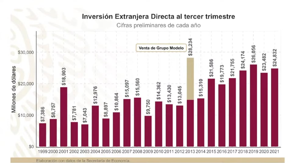 Suorat ulkomaiset sijoitukset (Foreign Direct Investments – FDI − Inversión Extranjera Directa – IED) olivat vuonna 2019 vajaat 26,1 miljardia dollaria, vuonna 2020 taas 23,5 miljardia ja 2021 puolestaan 24,8 miljardia. Vuosien 2019 ja 2021 luvut ovat historian korkeimpia ja ne on ylitetty vain 2013, jolloin olutalan jättiläisen Grupo Modelon myynti muodosti noin puolet koko 28,2 miljardin dollarin investoinneista ja ilman sitä lukemat olisivat olleet käytännössä samalla tasolla kuin 2014, jolloin päästiin 15,3 miljardin euron lukemiin. Vasemmistohallitus on joutunut kohtamaan koronakriisin kaikkine sosiaalisine ja taloudellisine seurauksineen, mutta sen valtaan nouseminen ei ole tyrehdyttänyt talouden mittareita. Päinvastoin sen irtaantuminen uusliberalismista on tuonut talouteen uutta virtaa muun muassa aktivoimalla sisämarkkinoita ja lisäämällä kansalaisten kulutusvoimaa. Koska korruptio ei vääristä enää yritysten välistä kilpailua, samojen olosuhteiden luominen kaikille taloudellisille toimijoille vakauttaa koko järjestelmää, mikä heijastuu myös ulkomaisten sijoittajien kiinnostukseen. Koska Meksiko on maailman suurimman talouden tärkein kauppakumppani ja uusi kolmen Pohjois-Amerikan valtion vapaakauppasopimus (T-MEC − USMCA – CUSMA) astui voimaan 1.7.2020, luontaisesti Meksiko on pitkälle kehittyneenä taloutena ja OECD-maana yksi kymmenestä eniten ulkomaisia investointeja houkuttelevista maista maailmassa.