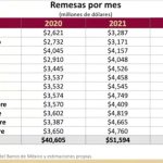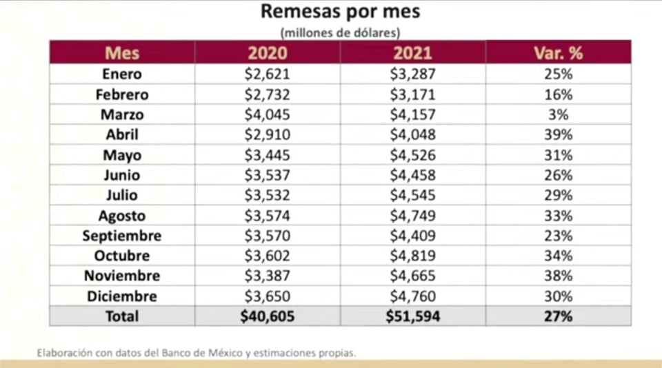 Yhdysvalloista Meksikoon suuntautuvat rahalähetykset ovat myös yksi keskeisistä talouden mittareista. Vuoden 2020 lopussa yllettiin 40,6 miljardiin dollariin, mutta vuoden 2021 uusi ennätys 51,6 miljardia dollaria – missä kasvua oli peräti 27,1 prosenttia − ei ole enää kovin kaukana esimerkiksi koko Suomen valtion vuosibudjetista. Suomen hallituksen talousarvioesitys vuodelle 2022 oli 64,8 miljardia euroa, jossa alijäämää on ainakin 6,9 miljardia, sillä valtion tulojen arvioidaan jäävän 57,9 miljardiin euroon. Siirtolaisten rahalähetykset kohdistuvat noin kymmenelle miljoonalle perheelle ja niiden keskimääräinen summa yltää 350 dollariin kuukaudessa.