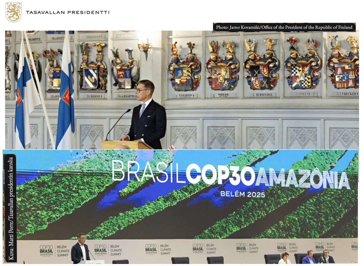 Suomen presidentti Alexander Stubb ohjeisti kansakuntia COP30-ilmastohuippukokouksessa Belémissä, Brasiliassa, 6. marraskuuta 2025 kolmella kehotteella: ”Ensiksikin meidän kaikkien on näytettävä esimerkkiä. … Toiseksi meidän on annettava tieteen näyttää