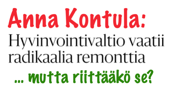 Kommunisti Anna Kontula vaatii ”hyvinvointivaltion radikaalia remonttia. Hyvinvointiyhteiskunta on törmäämässä ekologisiin rajoihin. Niinpä on laadittava ”yhteiskunnalle kaksikärkinen muutosohjelma” ja kysyy: ”Miten ihmisten sosiaalisia oikeuksia voidaan turvata ekologisten rajojen puitteissa?” ja vastaa: ”Nähdäkseni